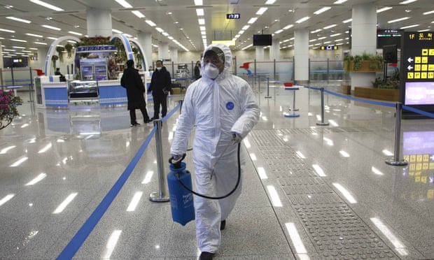 | A worker in protective gear carries a disinfectant spray can through a nearly deserted terminal at Pyongyang airport. Photograph: Jon Chol Jin/AP |