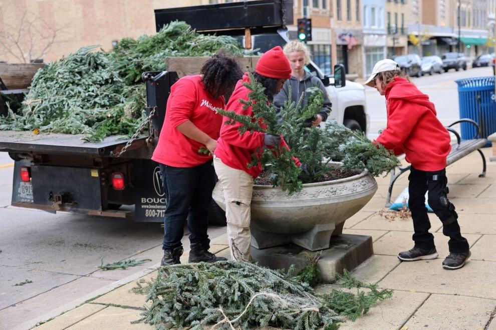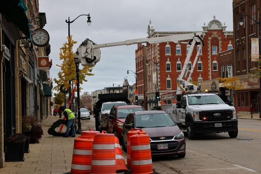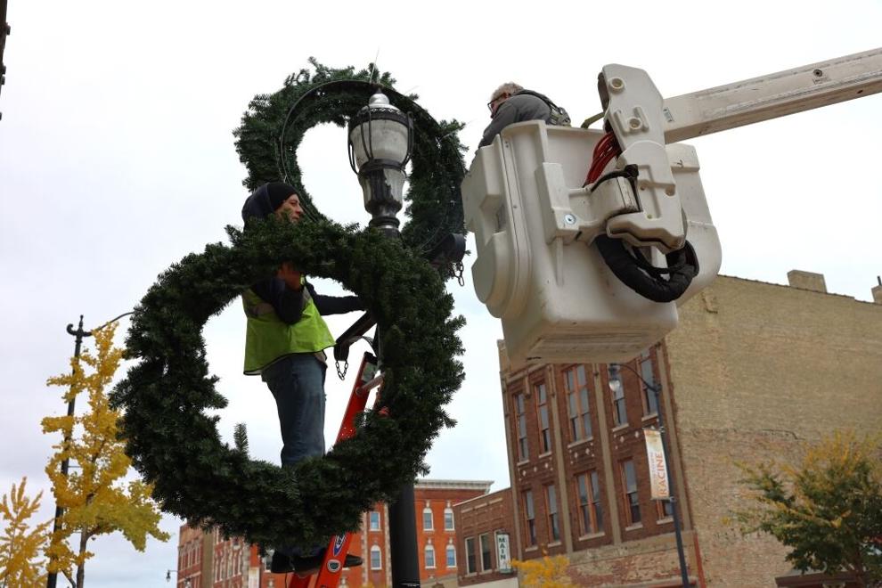 Eric Olson, left, and Bob Graves secure wreaths to light posts ahead of the holiday parade in Downtown Racine. |